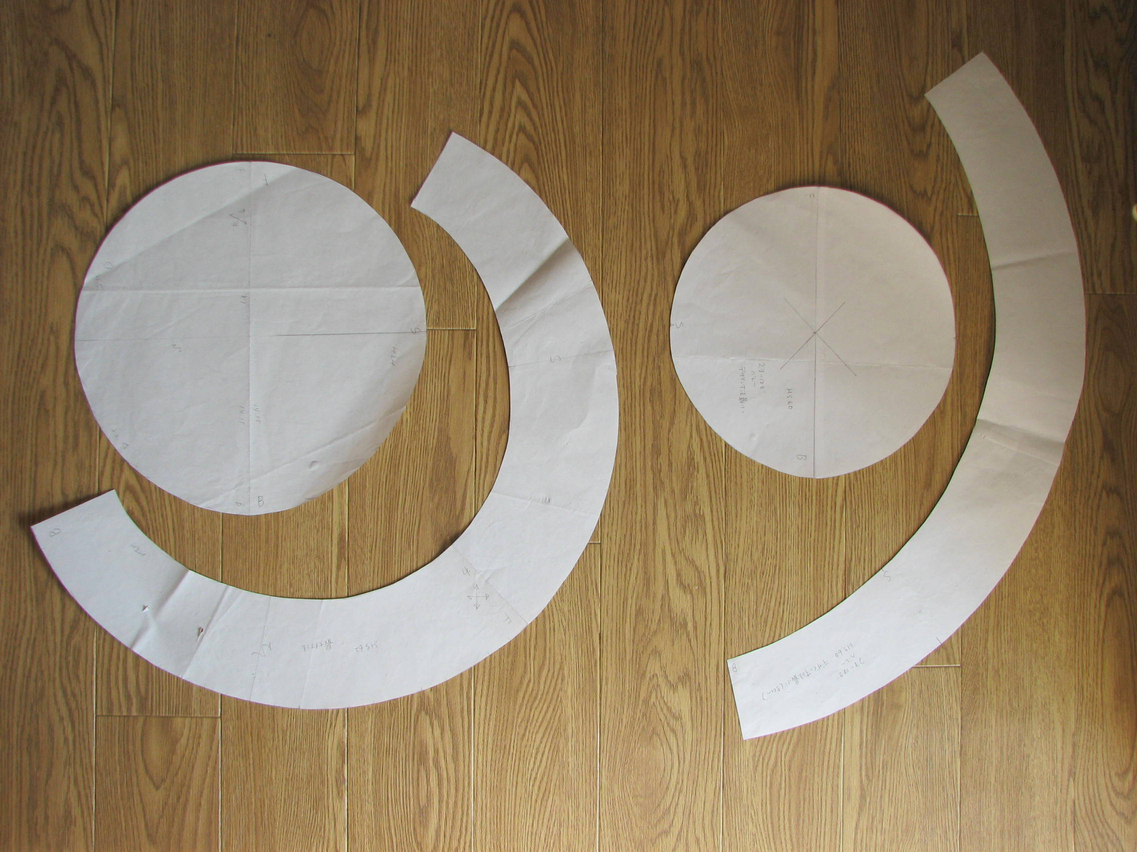 デザイン寸法最小(右)の方、カーブがまっすぐに近くなり、とうとう直線になると円筒形の帽子の型紙になります。