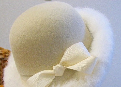 クラウンはすこし角ばった形、 くだんのブリムはエッジにぐるりとファーをとめつけています。