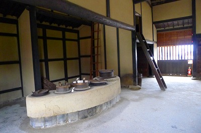 大きな土間にはおくどさんが。その上半分のしきりが「煙返し」で、