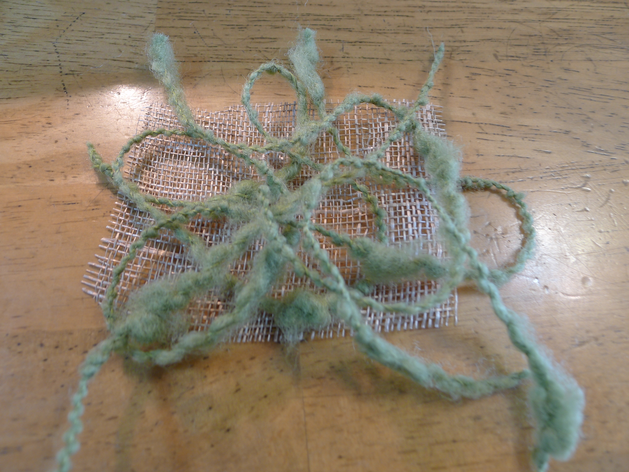 シナマイとは麻のシートのようなもので、それにお気に入りの糸や毛糸をランダムに置きます。