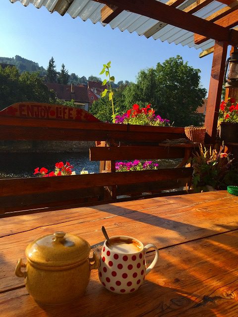 川に突き出たテラスでオーナーがコーヒーを淹れてくれました。