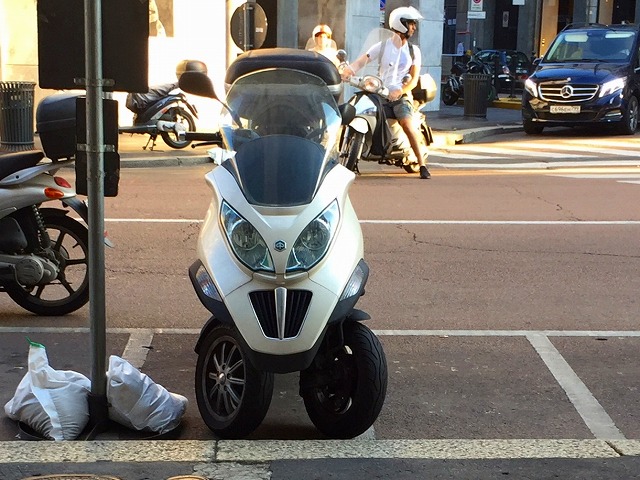 この前にとまっているオートバイの前輪が2つなのが面白かったです。