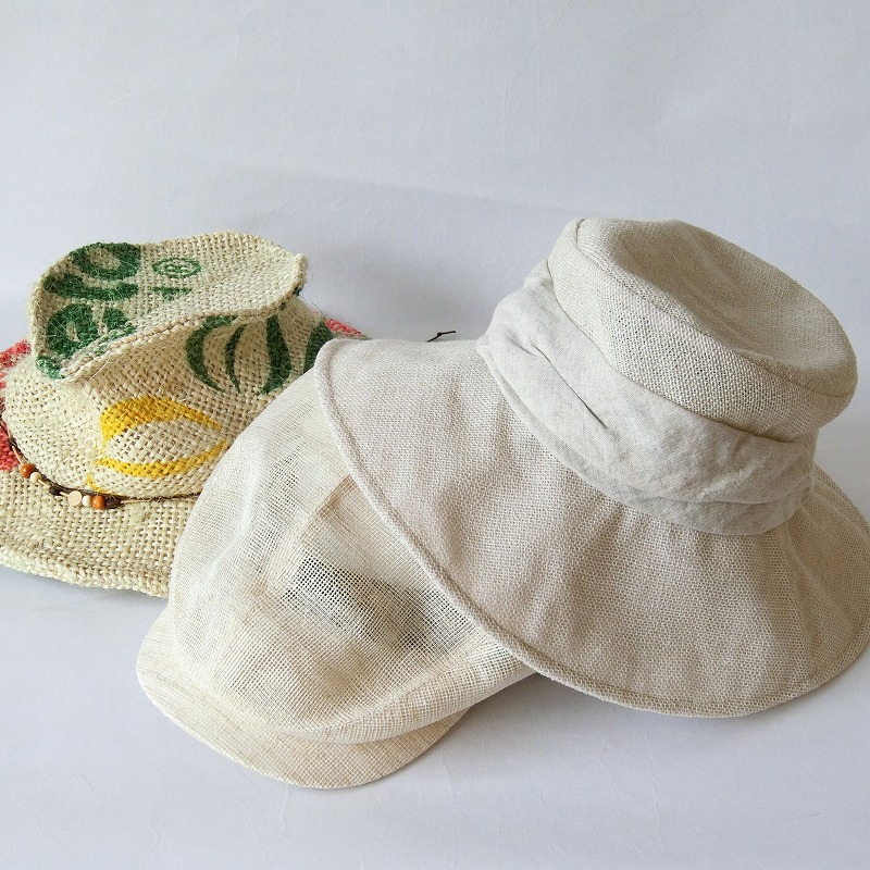 麦わら帽子をはじめ、夏にうれしい軽いスケスケ素材の帽子や、夏用ベレーなど室内でもOKの帽子が並びます。男性でもかぶれるユニセックスなものが多いのでぜひおいでください。