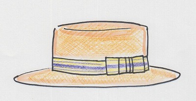 いわゆるカンカン帽のことです。クラウンが円筒形、ブリムが平たいのが特徴です。カンカン、というコトバは、たたくとカンカン音がするくらい硬いところからきているようです。ユニークな形ですが、そこまで硬いのはかぶりごこちがいまひとつ、ということが多いです。カンカン帽